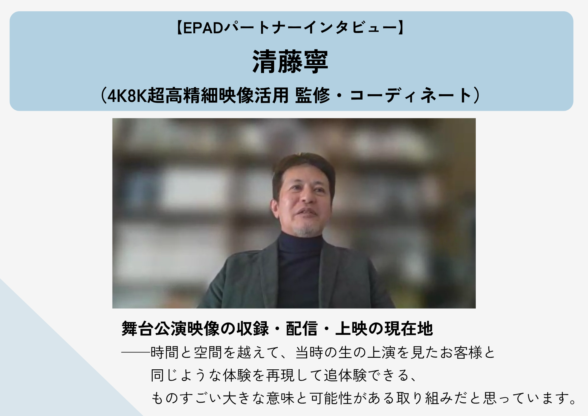 NHKで報道番組のディレクターやプロデューサーとしてキャリアを重ね、東京オリンピック・パラリンピックに向けて立ち上がった4K・8K放送の普及や広報にも携わってきた清藤寧(せいとう・やすし)氏。その専門性は、EPADが推進する8K収録や上映イベントにおいても大きな力を発揮している。8Kという技術を長年