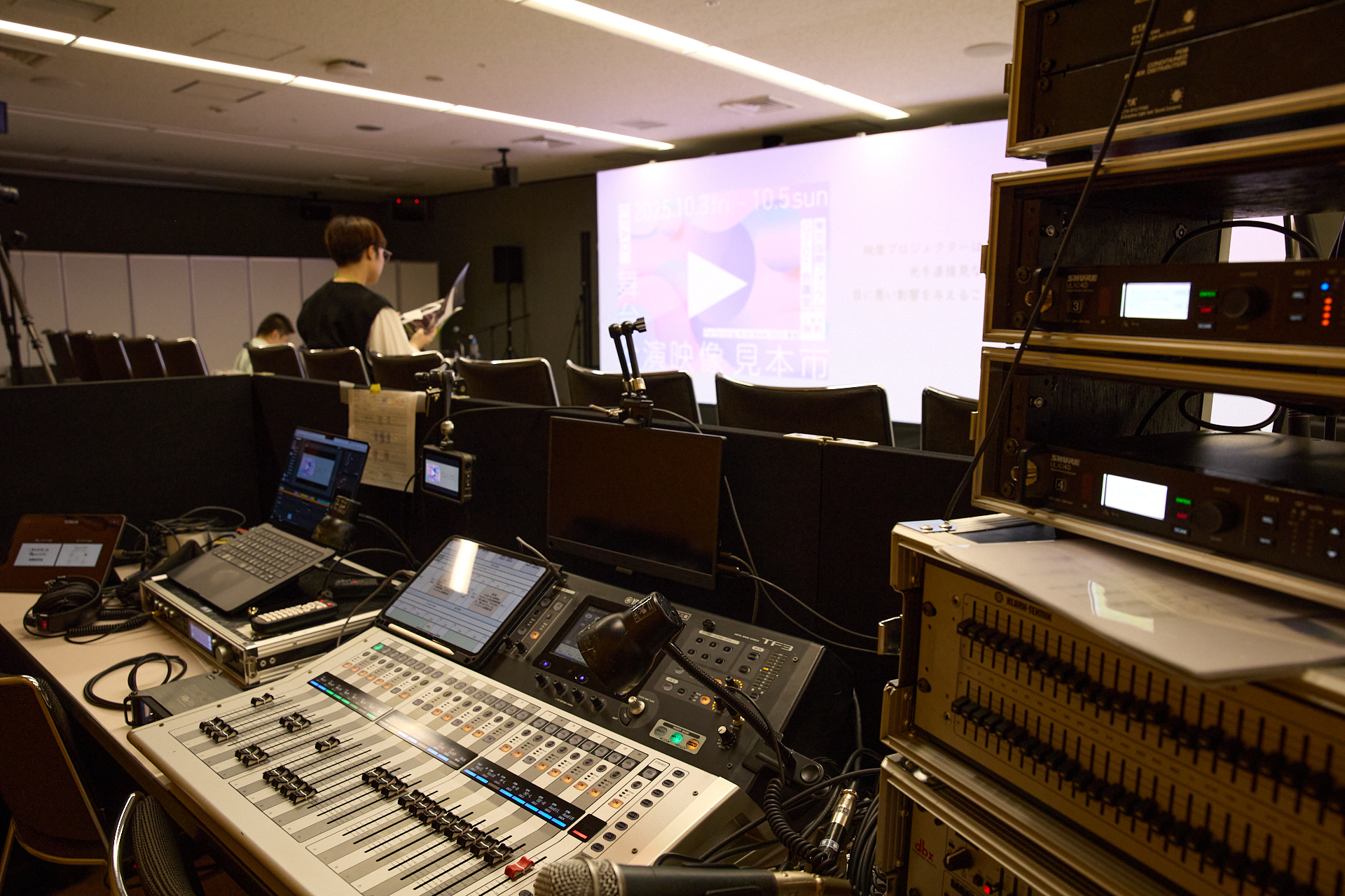 説明会では、実際に定点映像を観ながら、上映会を支える設備や機材についても解説。劇場間口を覆うサイズのスクリーンや、マルチトラック再生で臨場感を増す音響システムなど、より臨場感のある鑑賞体験をもたらすためにEPADが行っている実践的な工夫を紹介。