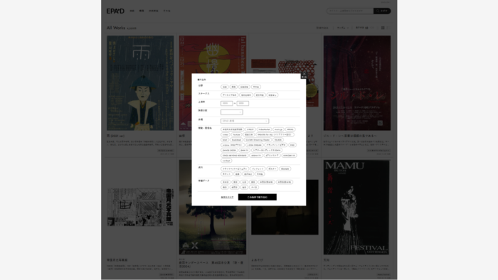 「EPAD作品データベース」は、EPADがアーカイブする舞台公演映像等の作品情報や権利情報を整理した、舞台芸術データベースです。過去の作品の情報やチラシ・舞台写真が掲載されている他、視聴可能な場合はその視聴方法もご案内しています。分野やステータス、上演年などから作品が検索できるとともに、キャストやスタッフ、ジャンルなどから周遊が可能です。